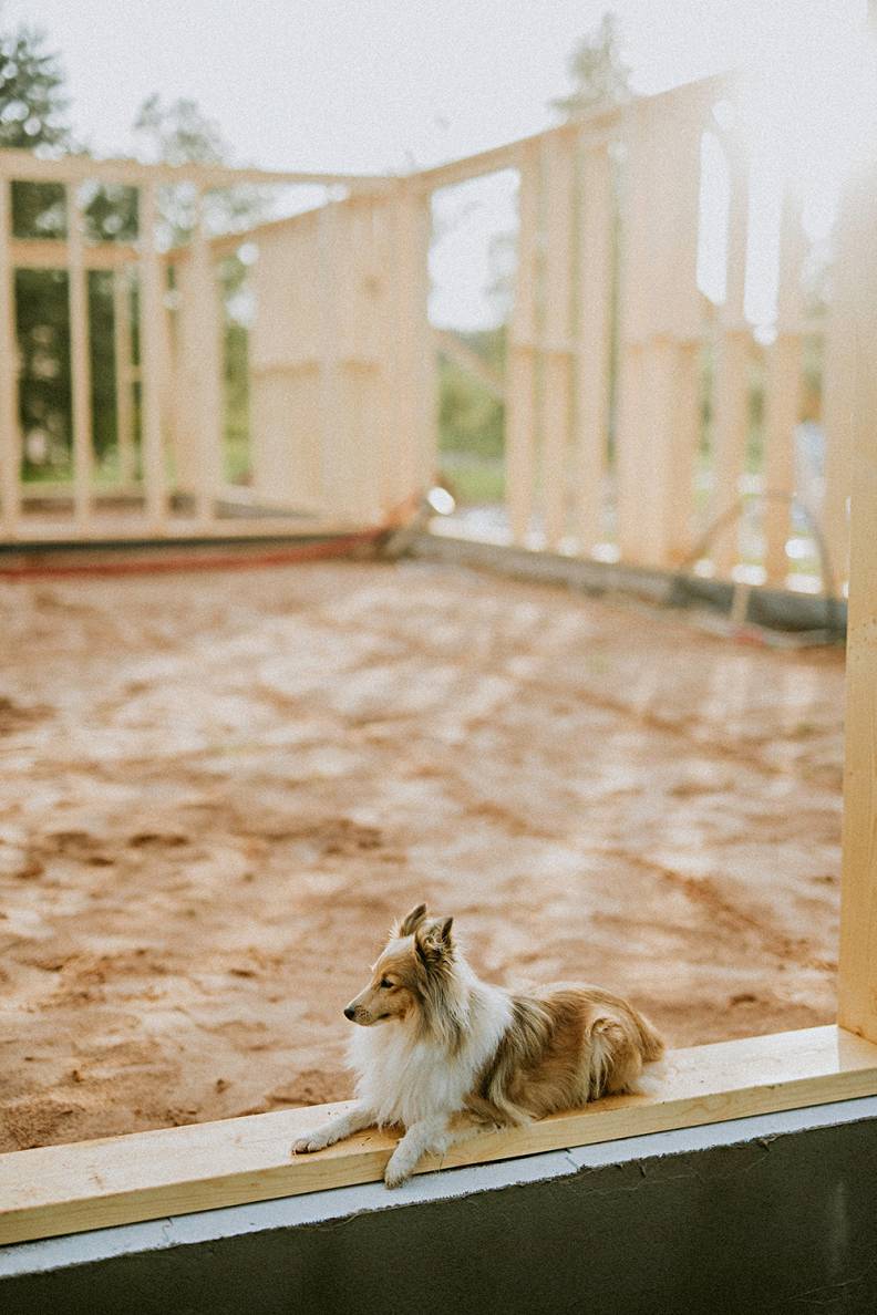 «Klāt bija grūtākais darbs – pamatnes izlīdzināšana. Mums mainījās sākotnējais plāns par to, cik biezu grīdas siltinājumu liksim – 20 cm vietā to sarucinājām līdz 12 cm un izvēlējāmies citu, izturīgāku un siltumizolējošāku materiālu, kuru atradām somu ražotāja piedāvājumā. Līdz ar to vispirms pašiem bija jāpieved un jāpieber grīdas slānis ar tonnām akmeņu. Vietas, kur plānoti logi, jau bija aiztaisītas ar plēvēm, lai nav caurvējš un māja būtu pasargāta no lietus, tāpēc piekļūt iekštelpai varēja tikai pa durvju ailu. Vedām smagas ķerras ar akmeņiem un smiltīm. Tālāk visu apjomu vajadzēja vairākas reizes blietēt. Tas nav nieka darbs – 7 m platumā nolīdzināt smiltis. Vīram mājas celtniecības laikā nekādu sporta zālīti nevajadzēja – katra diena bija fiziskā spēka izaicinājums. Lai gan bija pamanījies vēl mūsu būvobjektā iekarināt pievilkšanās stieni… Tas jāatzīst – ja gribi būt labā fiziskā formā, cel māju!