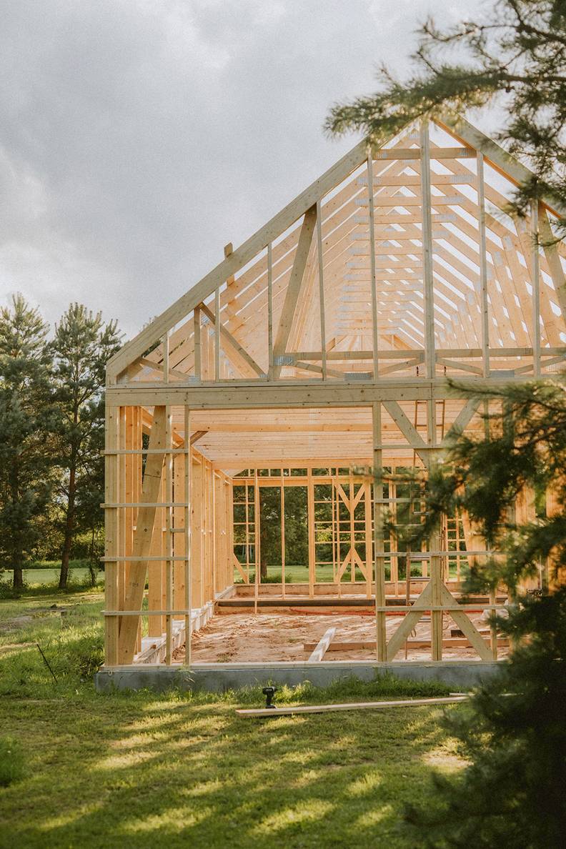 «Nākamais celtniecības etaps bija jumta karkasa izbūve. Iepriekš siltumnīcai un garāžai likām spāres – abas ēkas ir 4 m platumā, bet māja – 7,5 m, un, pēc teorijas, sākot no 6 m, ir ieteicams izmantot kopnes. Tās pasūtījām JK Timber, kas arī konsultēja par uzstādīšanu.