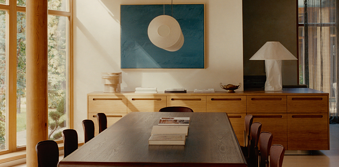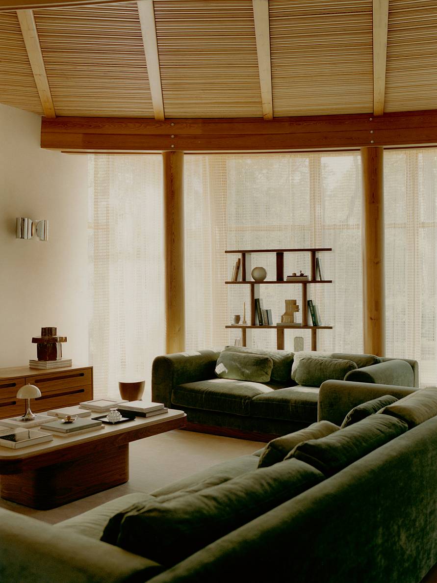 Toņu gamma aiz loga harmoniski turpinās interjerā, radot vienotu vizuālo un emocionālo pieredzi. Ēkas dzīvojamās zonas centrā uzmanību piesaista Kanttari izgatavotais dīvāns no rieksta masīvkoka ar kvalitatīvu polsterējumu un audumu. Pie sienas – dizainera Tobia Scarpa 1966. gadā radītā lampa Foglio.
