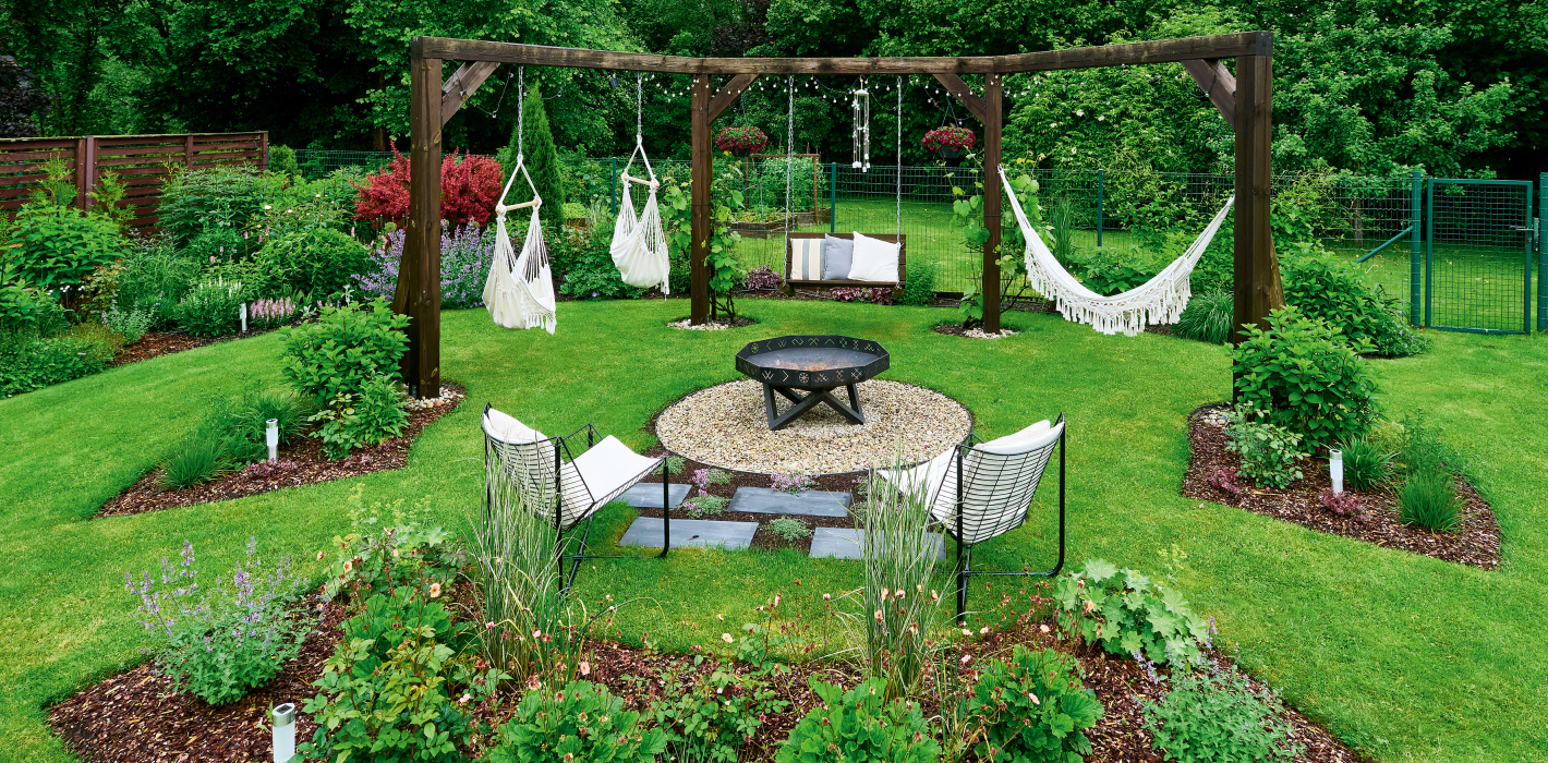 Šajā dārzā uzmanību vispirms piesaista omulīgais šūpuļkrēsls un šūpuļtīkli, kas saskanīgi iederas kopējā ainā. «Reizēm dārzu jāmāk vienkārši baudīt,» uzskata dārza saimniece.