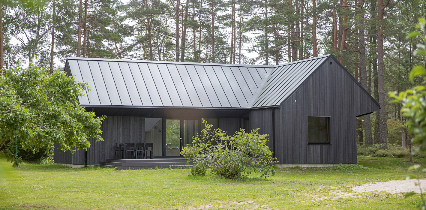 Kad pirms pāris gadiem izlēmām vīra dzimtas īpašumā Pūrciemā būvēt jaunu māju, bija būtiski, lai tā būtu no maksimāli dabiskiem materiāliem. Tāpat bija skaidrs, ka ne divstāvu būves, ne plakanie jumti šai piekrastei nav raksturīgi, tāpēc, respektējot kluso piejūras vidi un nevēloties ar mājas apjomu tajā dominēt, veidojām viena stāva projektu ar divslīpju jumtu un lielu terases zonu.