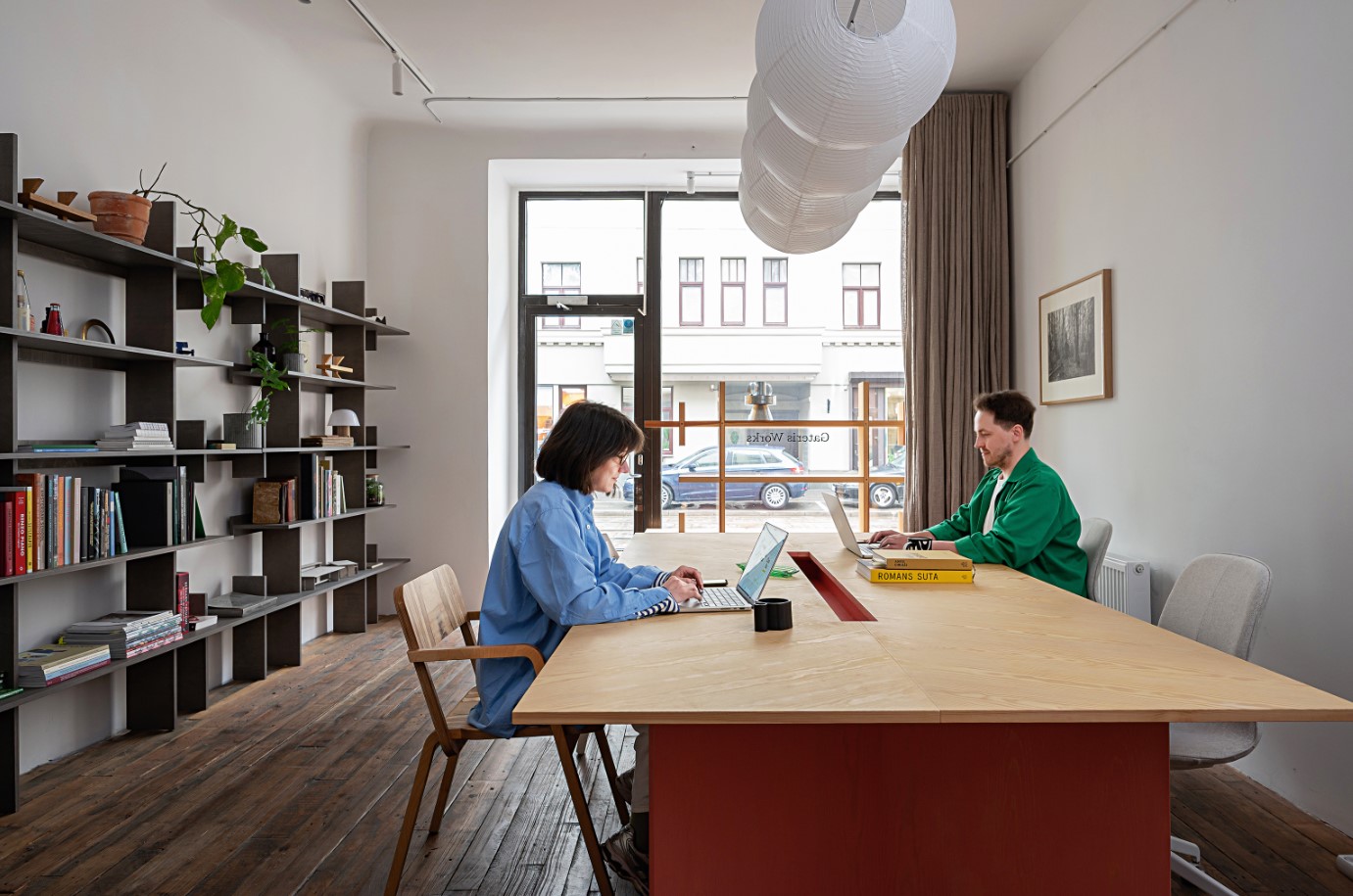 Iepriekšējie nomnieki telpās bija ierīkojuši čurros ceptuvi, un viss smaržoja pēc eļļas. Vēl pirms tam šeit atradās telefonu remonta darbnīca Bīstamie sakari – telpas tiešām bija bīstamā izskatā. Tomēr abi redzēja vietas potenciālu. 60 m2 studiju veido trīs telpas – darbistaba ar koprades galdu centrā, atsevišķa maketēšanas telpa un virtuve, kas apvienota ar sapulču telpu. «Izejot no kapacitātes, nodefinējām, cik cilvēku šeit varētu strādāt, kāda būs klientu pieredze un kā mēs ikdienā jutīsimies,» stāsta Reinis.