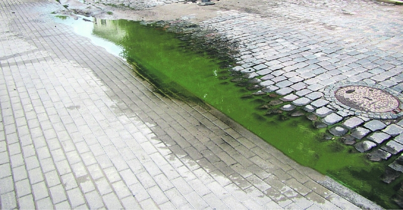 Hidrauliskās pārbaudes laikā siltumtīklu bojājuma vietā iespējama zaļganas krāsas ūdens noplūde (ūdens iekrāsots ar krāsvielu, kas nav veselībai un videi kaitīga). Tā izskatās līdzīgi kā foto: