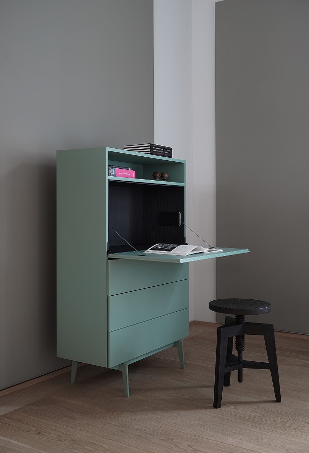 Pats esmu gandarīts arī par brīvi stāvošo virtuves moduļu sistēmu, jo tā ir vienkārša, estētiska, viegli montējama, ilgtspējīga. Savukārt zilā kumode ir funkcionāla un vienlaikus interjerā kalpo par košu akcentu.