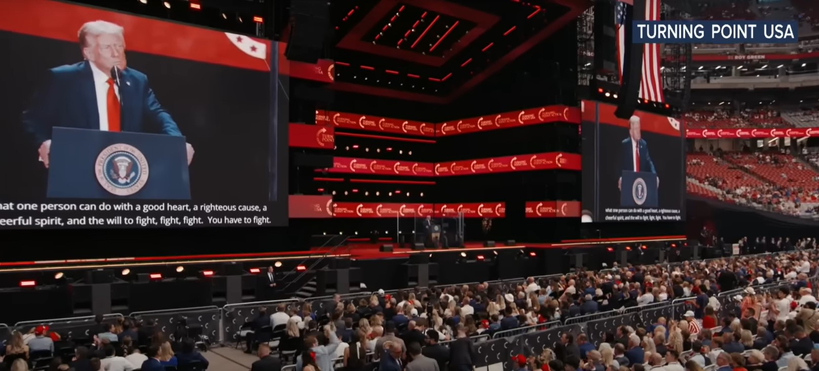 «Čārlzs Džeimss Kērks aukstasinīgi noslepkavoja radikalizējies briesmonis, jo viņš bija atļāvies skaļi paut patiesību, kas bija viņa sirdī, viņu vardarbīgi nogalināja, jo viņš runāja par taisnību, par Dievu, par šo valsti un veselo saprātu,» runā sacīja Tramps. Prezidents savu 40 minūšu garo runu deklamējis aiz bieza stikla aizslietņa. «Čārlijs Kērks ir amerikāņu varonis un moceklis,» paziņoja Tramps. Runas noslēgumā aplausu pavadībā uz skatuves iznāca Kērka atraitne, kura sirsnīgi apskāva Trampu.