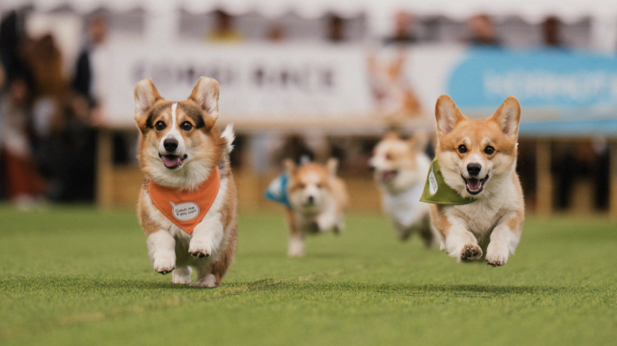 Korgiju skrējiens notika Viņģa parkā, kur četrkājainie mīluļi sacentās sprinta sacīkstēs – 50 metru skrējienā – stilizētā stadionā ar ietilpību līdz pat 6000 skatītāju.