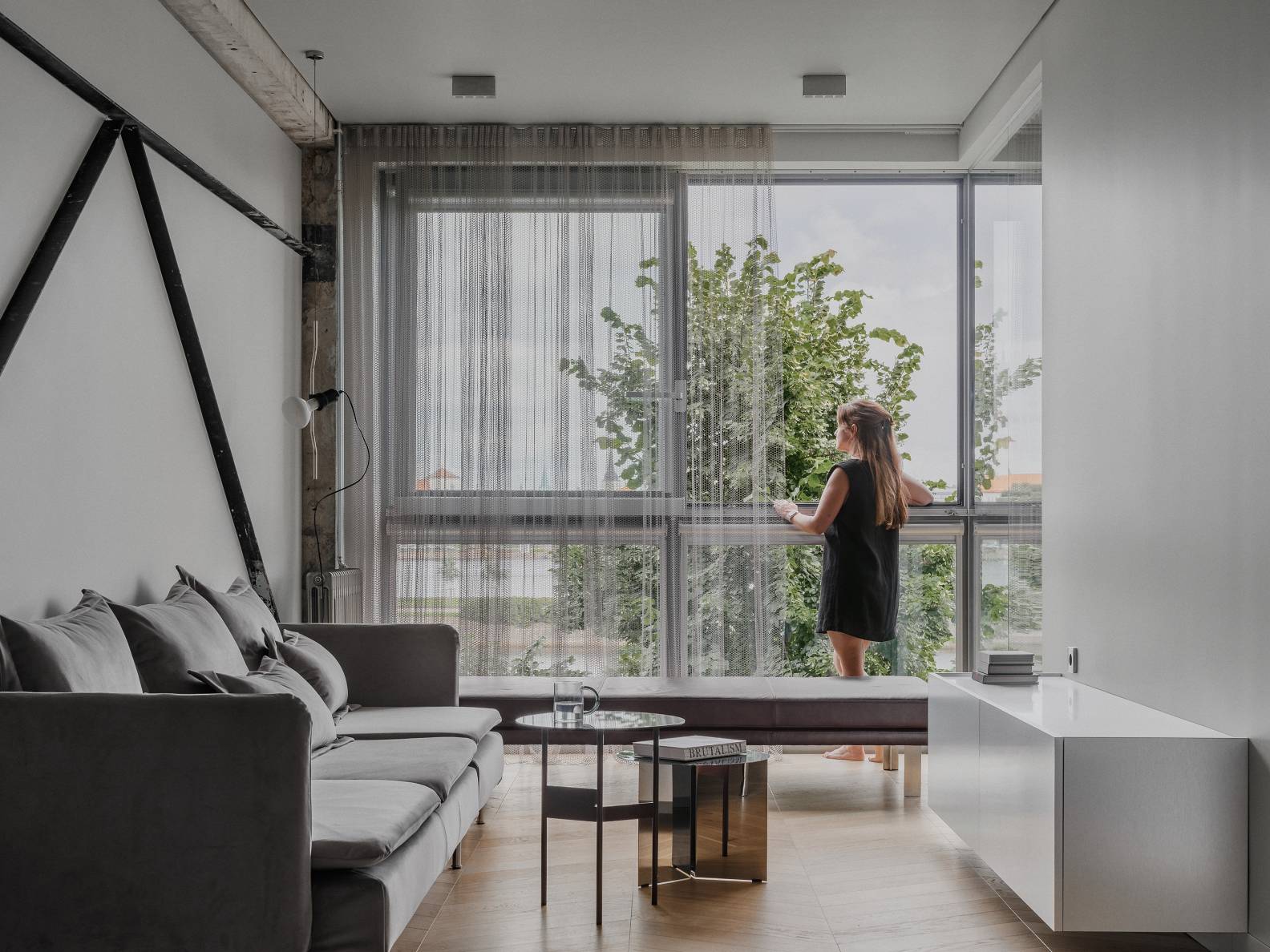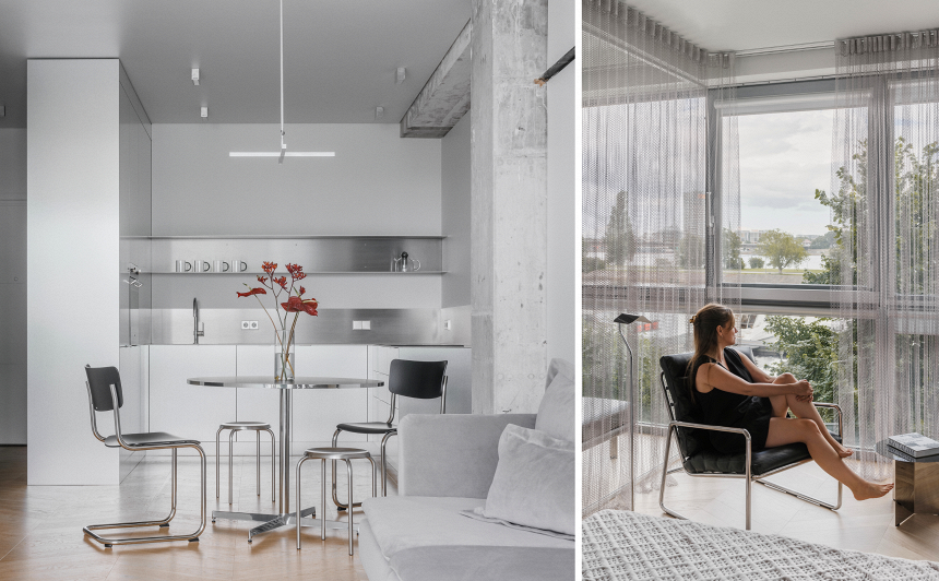 Pirms dizaina projekta veidošanas arhitekte Agate Eniņa veikusi dzīvokļa pārplānojumu, telpu pārdalot ar starpsienu, kas šobrīd nodala guļamzonu no viesistabas un atvērtā tipa virtuves. Starpsienas stiklotais gals, kurš atduras pret panorāmas logu, nesašķeļ ainavu un piešķir nelielajai telpai optisko plašumu.