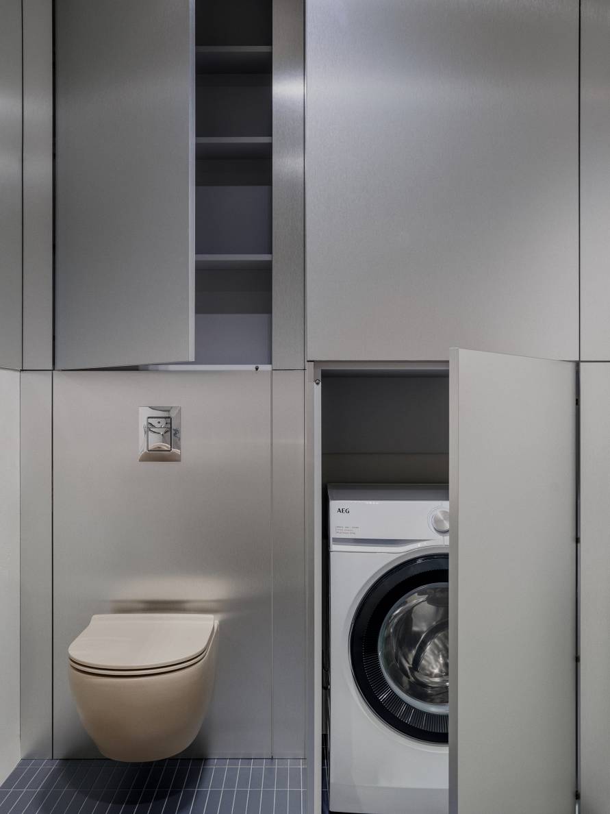 Superlakoniskās vannasistabas sienas paneļi slēpj plauktus sadzīves diskrētai uzglabāšanai.