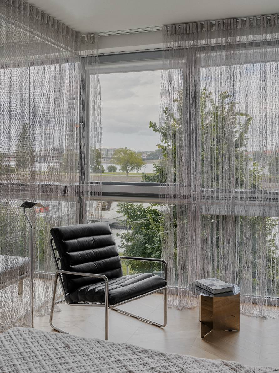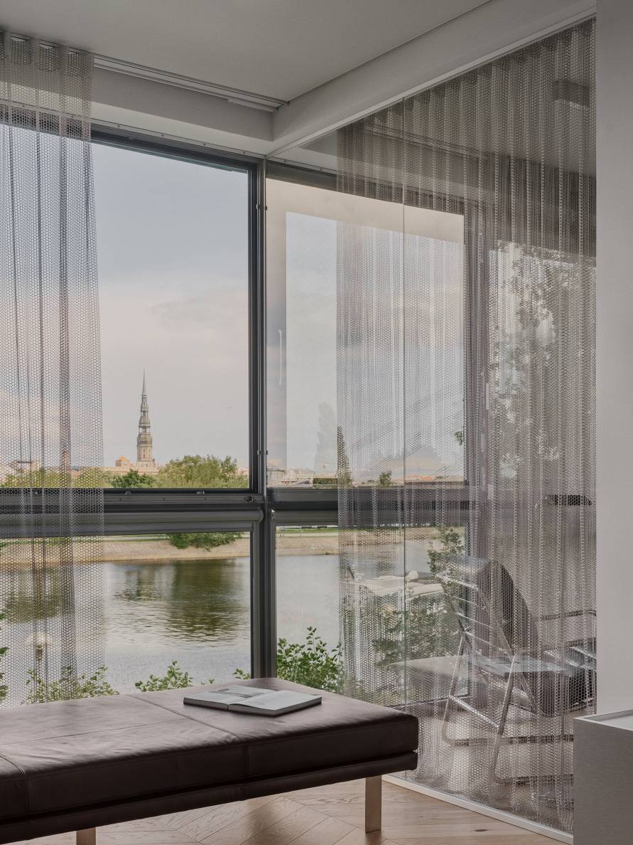 Marta Dzene atzīst, ka tieši iespaidīgais skats bijis vadmotīvs mājoklī radītajām interjera noskaņām. «Realizējām konceptuālu ideju par spoguļošanos pret upi. Atspulga motīvs parādās, sākot no guļamistabas skapja līdz kafijas galdiņam, –viss dzīvoklis ir mazliet vizuļojošs. Šeit parādās arī plūsmas elementi, piemēram, dabiskā akmens plāksnē, kas rotā vannasistabas sienu.»