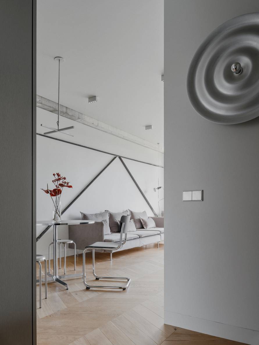 Dīvāns pirkts IKEA, bet apvilkts ar speciāli šūtu pārvalku no kvalitatīva auduma. Mēbele izvēlēta ērti maināmā pārvalka funkcijas dēļ, īres dzīvoklī tas ir svarīgi. Pie dīvāna – Hay kafijas galdiņi. Saimnieku izvēlētais franču parkets skujiņas rakstā piešķir metāliskajiem motīviem siltumu un eleganci. Tā materiāls – ozolkoks ar zarojumu – labi papildina dzīvokļa noskaņu.