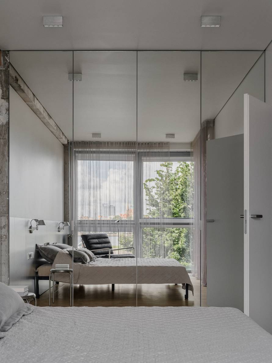 Spogulis guļamistabas skapja durvju plaknē pavairo pa panorāmas logu plūstošo gaismu un ienes ainavu vēl dziļāk telpā.