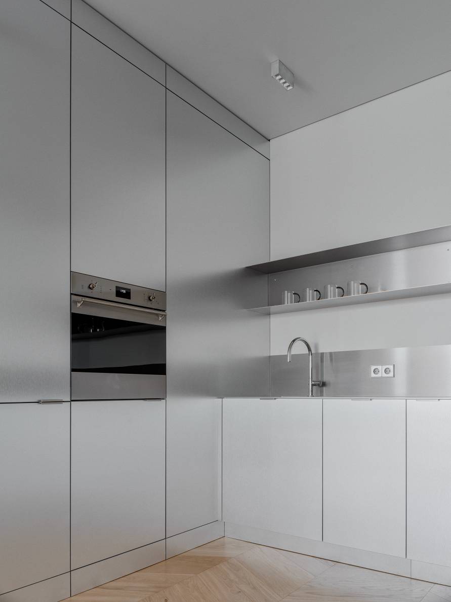 Ideja par metālisko motīvu virtuvē pieder dzīvokļa saimniekiem. Izmantota divu materiālu kombinācija – fasādes ir ar plānu alumīnija kārtu pārklātas MDF plātnes, savukārt virsmas, sienas panelis un plaukti izgatavoti no nerūsējošā tērauda.