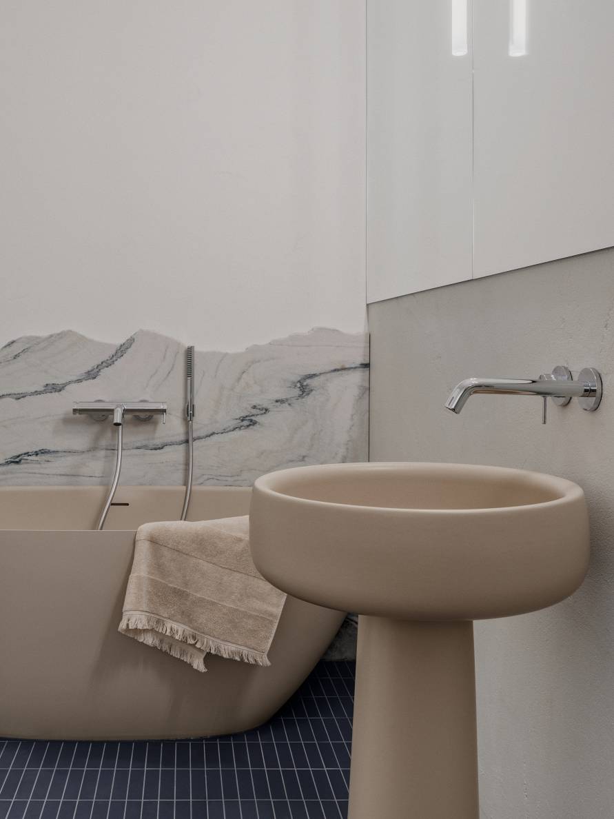 Brīvstāvošā izlietne un vanna turpina minimālisma valodu arī privātākajā no telpām. Aiz vannas – dabiskā akmens vilnis. Gaismekļi atrasti Büro Modena dizaina lietu katalogā.