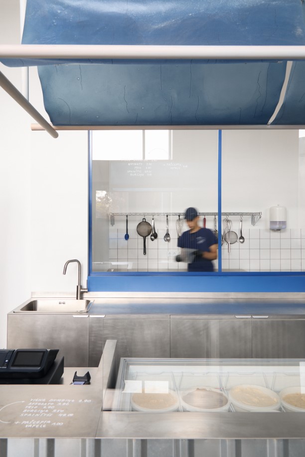 Evai īpašs prieks par stikla durvīm: «Gribējām ar vieglu metāla rāmi, tādas kā mākslas skolās Nīderlandē. Aptaujājām daudzus ražotājus, bet neviens to nespēja piedāvāt. Metālmākslinieks Edgars Spridzāns mūs saprata no pusvārda. Nostrādes pakāpe ir vienkārši izcila.» Esot veikalā, rodas klātesoša sajūta saldējuma radīšanas procesā, jo cauri stiklotajām starpsienām var ielūkoties saldējuma tapšanas aizkulisēs.