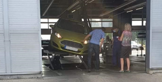 Fotogrāfijā redzams, ka automašīna ir būtiski sasvērusies. Iespējams, apskates stendam ir tehnisks defekts, tāpēc automašīnu nav izdevies pacelt pilnībā, kā tas būtu ierasts ikdienā.