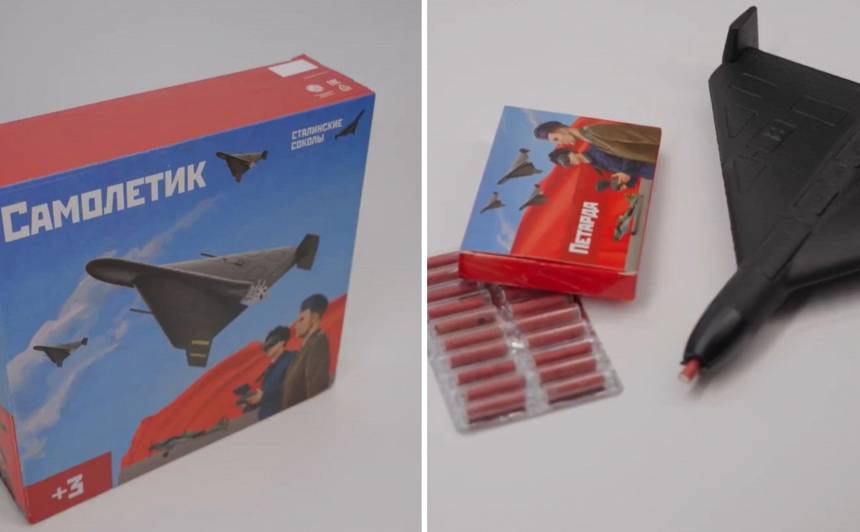 Vietnē Ozon, ko bieži dēvē par Krievijas Amazon parādījies jauns produkts – rotaļlieta bērniem – mazs putuplasta drons, Geranium-2 kopija, kas ir Irānā ražotā drona Shahed Krievijā lietotais apzīmējums. Aprakstā prece ir norādīta kā «piemērota bērniem no 3 gadu vecuma» un apgalvots, ka tā attīsta «koordināciju, precizitāti un iztēli». Mantiņa tiek raksturota arī kā «ideāla dāvana jaunajiem patriotiem un nākotnes debesu iekarotājiem».