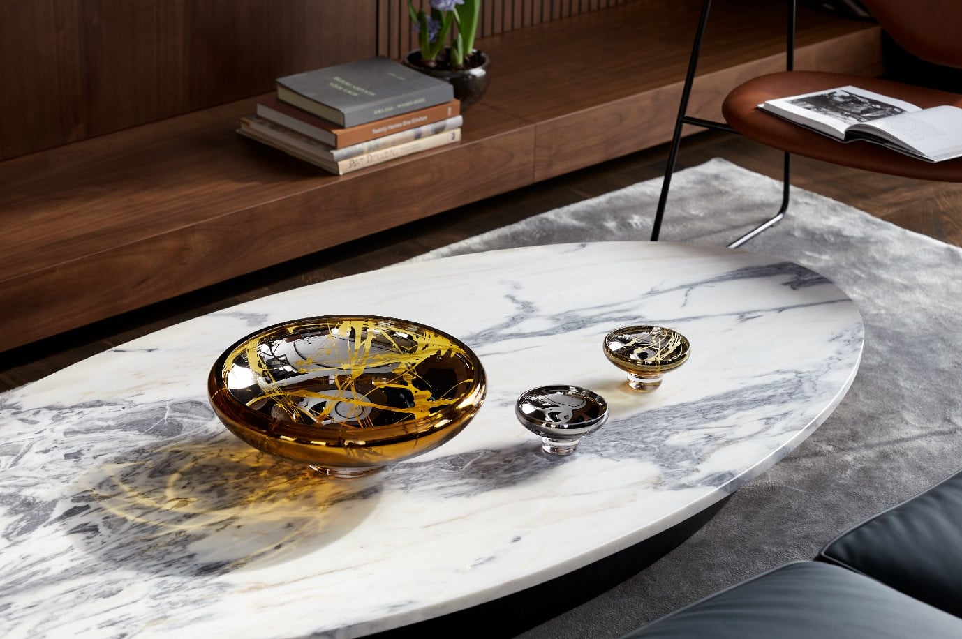 Esam strikti definējuši, ka radām traukus. Kolekcijā ir arī sienas dekoru modeļi, taču tie ražoti pēc viena standarta, un man kā māksliniekam šis būrītis ir par mazu. Tāpēc veidoju individuālos projektus, kā mēdzu teikt, dullības. Visu laiku esmu bijis aktīvs mākslas pasaulē, kā arī veidojis stikla rotas, akustikas objektus, gaismekļus, radījis stikla velosipēdu, kas joprojām eksponēts Šanhajas muzeja pamata ekspozīcijā. Jebkurš mākslas notikums saistīts ar domāšanas procesu, kas visbiežāk noved pie jauna produkta. Tā ir ķēdīte – kad atrodi recepti vienam priekšmetam, saproti, ka vari uztaisīt grupu, tad vēl un vēl… Arī trauku kolekcijas dzimušas procesā – idejas rodas darot.