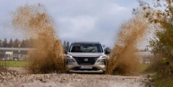 Mārketinga triks vai ne, bet ražotājs apgalvo, ka e-4ORCE divu elektromotoru pilnpiedziņa strādā 10 000 reižu ātrāk nekā mehāniskā piedziņa. Sistēma tiešām zibenīgi pārdala jaudu starp ratiem, lai pat pēc pamatīgas izprovocēšanas uz dubļaina seguma X-Trail saglabātu pilnvērtīgu kontroli. Uz vienas rokas pirkstiem var saskaitīt krosoverus, kas šādā rotaļu laukumā justos ērti. Vēlāk e-4ORCE spējas varējām pārbaudīt īpaši izveidotā bezceļu parkā, kas dažviet atgādināja Latvijas ceļu segumu pavasarī. Var teikt, ka auto mūsu apstākļiem ir gatavs un pie stūres jutāmies droši un pārliecinoši. To sekmē jaunā pilnpiedziņas sistēma, labs izsvarojums un tūlītēji pieejams griezes moments.”
