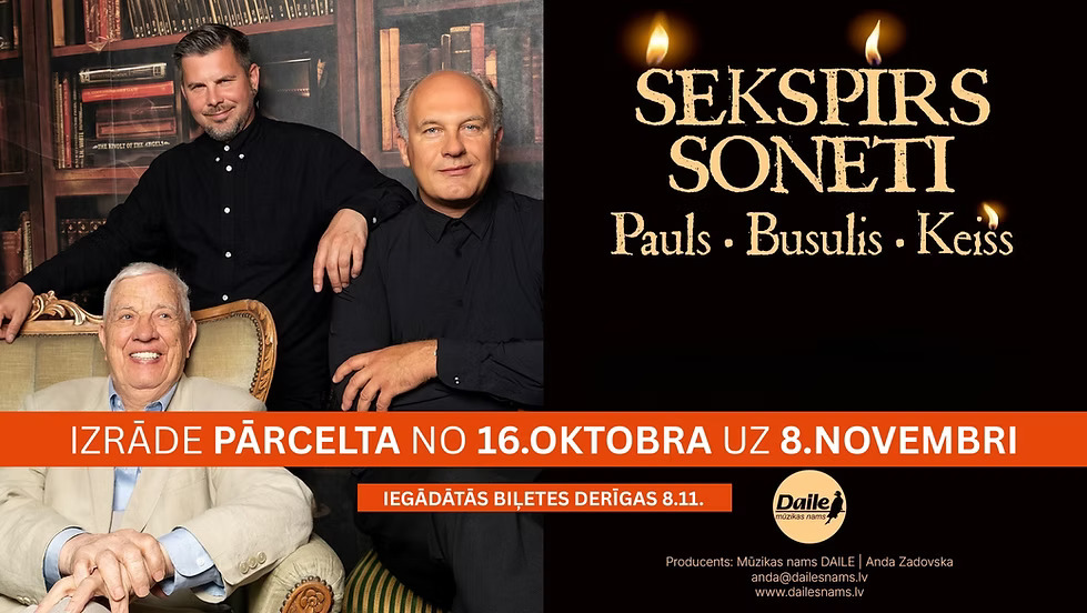 Pasākuma organizators informē, ka izrāde ŠEKSPĪRS.SONETI. Pauls | Busulis | Keišs, kas bija plānots 2025. gada 19.oktobrī plkst. 14 Mūzikas namā Daile, iepriekš neparedzētu apstākļu dēļ tiek pārcelta uz 2025. gada 9. novembri plkst. 14. Visas iegādātās biļetes būs derīgas jaunajā datumā.