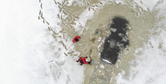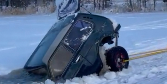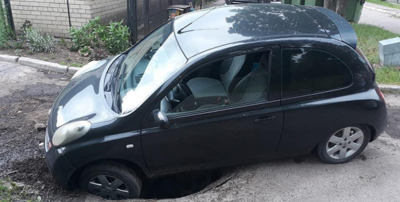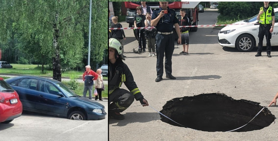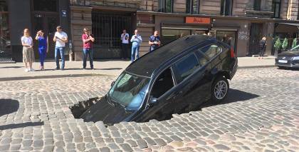 Aculiecinieka uzņemtajā fotogrāfijā redzams, ka automašīnas labās puses priekšējais ritenis ielūzis ceļa segumā.