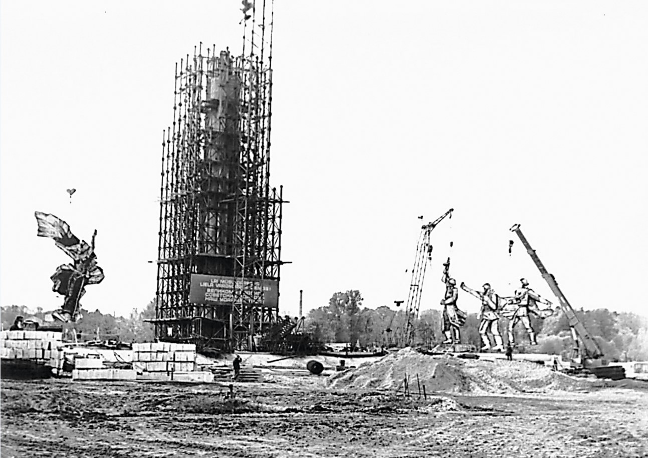 Lai memoriāls varētu tapt, tā pamatos iedzina dziļus pāļus, jo zeme šajā vietā ir diezgan purvaina. Celtniecībā izmantoja 1200 kubikmetrus betona, ko nācās atņemt citām būvēm. Tomēr termiņā tā īsti iekļauties tik un tā neizdevās, celtniecība ievilkās, tādēļ atklāšanu nācās pārcelt, beigu beigās to pieskaņojot Lielās Oktobra sociālistiskās revolūcijas nebūt ne apaļajai 68. gadadienai 1985. gadā.