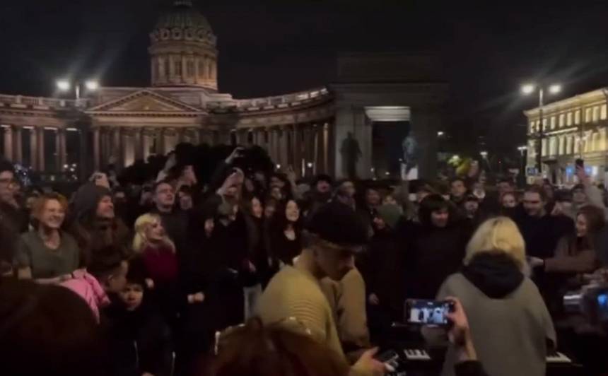 Pūlis pievienojās ielu muzikantiem pilsētas Ņevas prospekta ielā, lai dziedātu dziesmu Kooperatīvs Gulbju ezers. Šī dziesma tika aizliegta 2025. gada maijā, kad Sanktpēterburgas tiesa to atzina par «ekstrēmistisku».