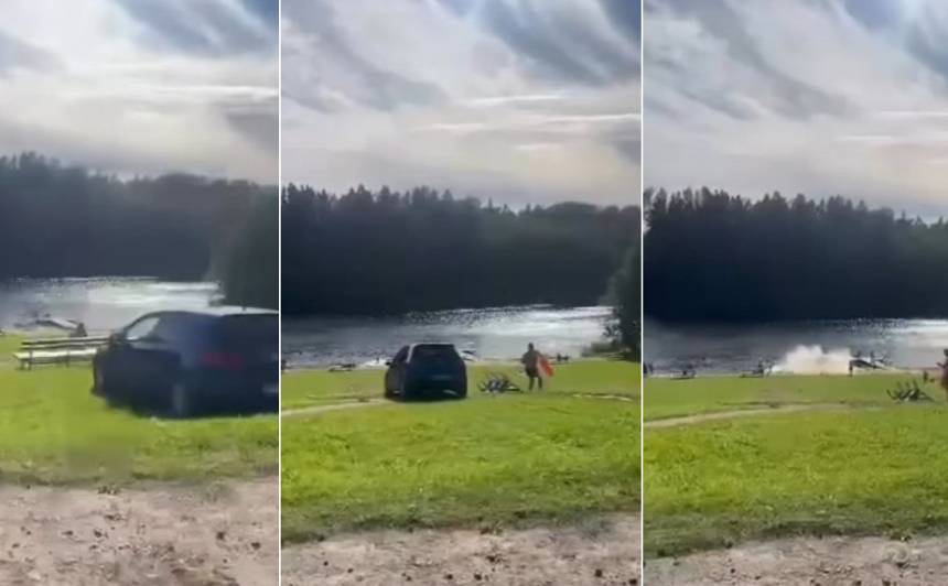 Aculiecinieka video redzams, kā stāvvietā atstāts auto pēkšņi sāk ripot atpūtnieku virzienā. Strauji uzņemot ātrumu, automašīna sašķaida vairākus atpūtas krēslus, finišējot ūdenstilpē. Pateicoties tam, ka cilvēki skaļi brīdināja, lai bēg malā no nekontrolētās automašīnas, neviens cilvēks negadījumā necieta.