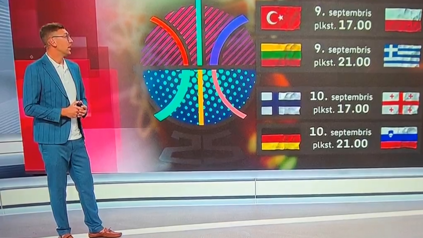 Stāstot par Eiropas basketbola čempionāta spēlēm, Ošenieks sauca ceturtdaļfinālu pārus, taču piemirsa Grieķijas un Slovēnijas karogus.