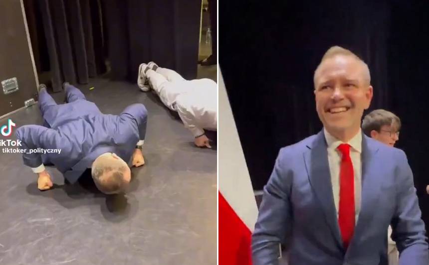 Polijas jaunievēlētais prezidents Karols Navrockis pievērsis sociālo tīklu uzmanību ar video, kurā viņš uz skatuves sacenšas atspiešanās skaitā ar kādu jaunieti.