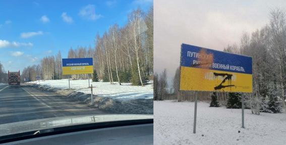 Uz Ukrainas karoga plakāta pirms pāris dienām tika uzlieta melnā krāsa, taču tagad tas ticis modificēts. Uz melnā plankuma uzlīmēts mazāks plakāts ar uzrakstu «Putler Kaput».