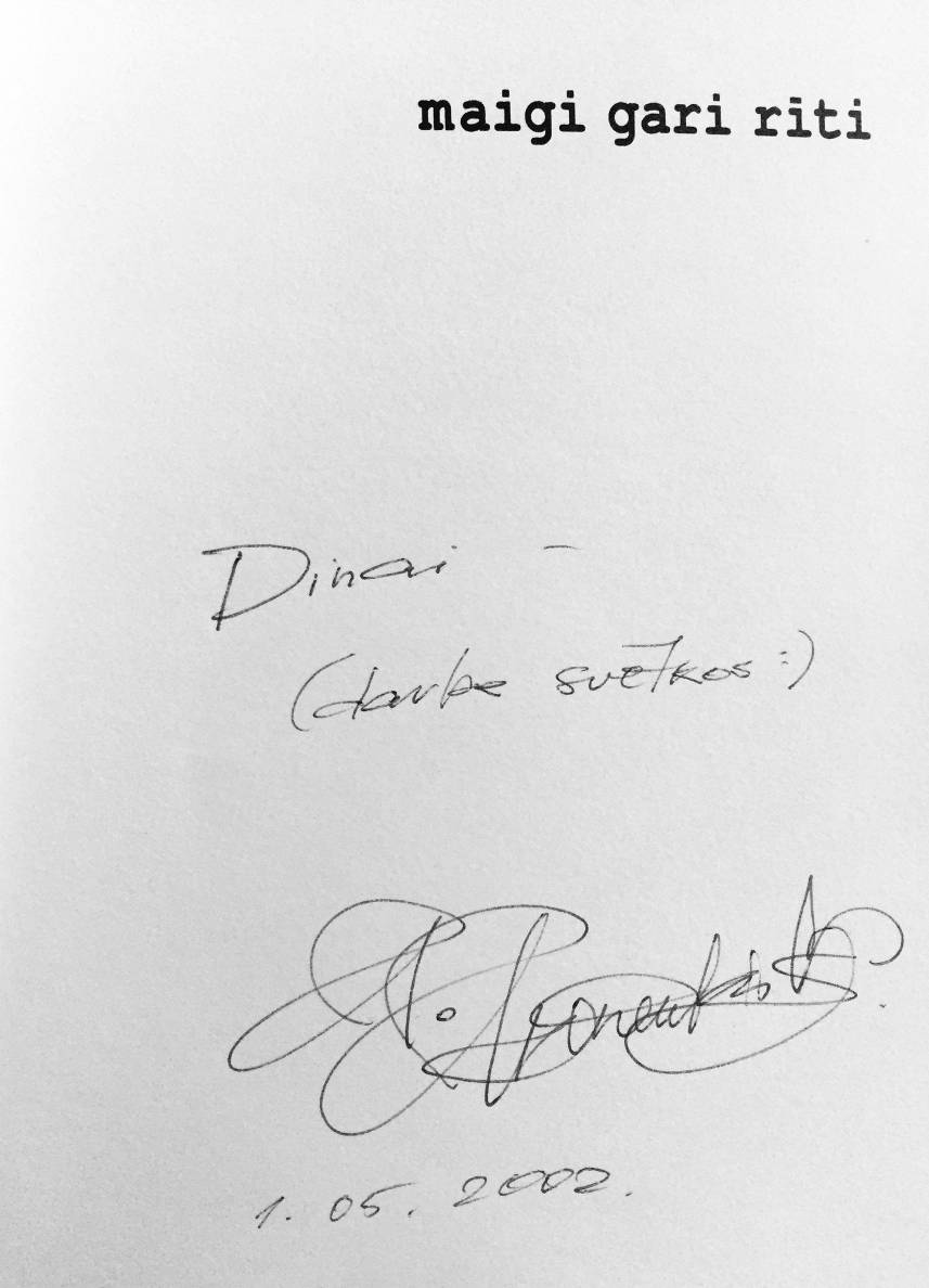 Reiz maija ziedonī rakstnieks pat atbrauca pie manis ciemos uz Dobeli ar svaigāko dzejas grāmatu azotē, kuras titullapu rotāja vārdi Dinai – darba svētkos :), datums un viņa autogrāfs. Pēc šī randiņa vēl labu laiku lidoju pāris centimetru virs zemes.