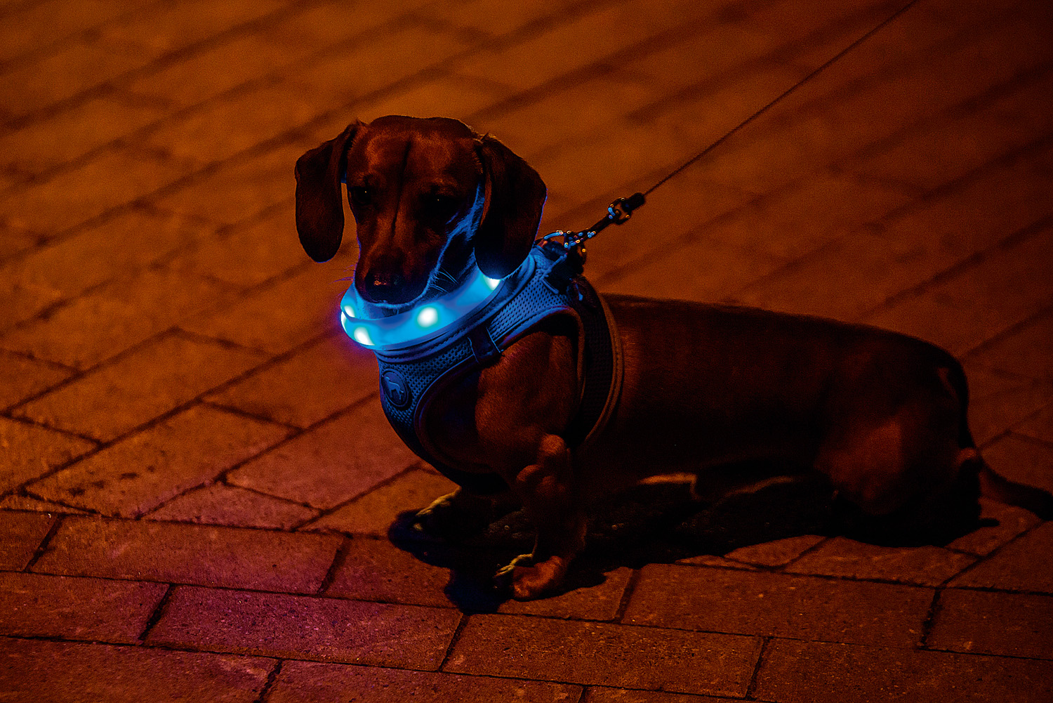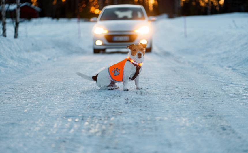 Labākā kombinācija drošībai LED lampiņu kaklasiksna + atstarojoša pavada vai veste. Tā suns būs pamanāms gan tumsā, gan automašīnu gaismās.