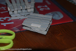 - Pēc tam ņem auklu uz izver cauri visiem 24 kvadrātiņu vidutiņiem, aiz katra knaģa iesienot mazu mezglu, vai ieverot mazu pērlīti, lai knaģi nekustētos, t.i., nesakristu viens otram virsū.