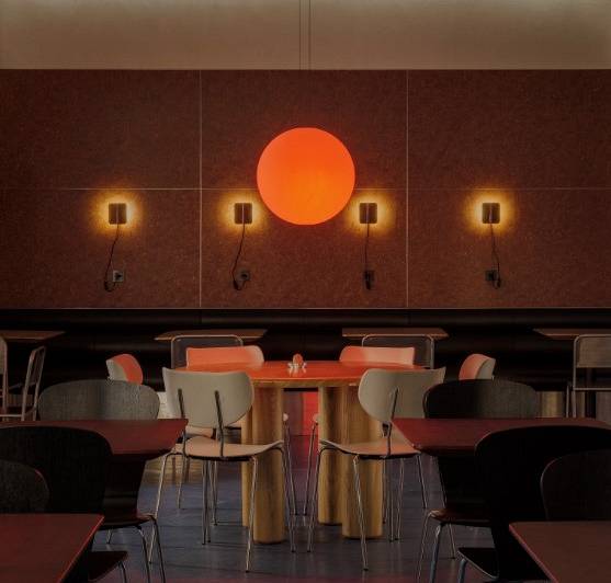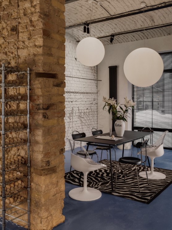 Nišā, kas atvēlēta vinila plašu atskaņošanai, uzmanību saista konsole, kas projektēta un izgatavota tieši šim mērķim. Interesanti, ka tā pagriezta nevis pret restorāna zāli (kā dīdžeja lete), bet sienu. «To darījām, lai paspilgtinātu vietas demokrātiskumu. Lai katrs var aiziet un uzlikt savu plati, jūtoties kā mājās vai ciemos pie draugiem,» skaidro dizainere. Virs nišas novietoti skaļruņi mazliet provokatīvā bubble gum tonī – roku darbs, kas kā rotaļīgs interjera elements pilda gan dekoratīvu, gan praktisku funkciju. Virs lielā ēdamgalda – zīmola Vibia lampa, kuras gaismas toni iespējams mainīt ar telefona lietotni. Dekoratīva loma ir arī diviem svītrotajiem auduma krēsliem no zīmola Miniforms, tie novietoti pie apaļa galdiņa nostāk iekārtotā zonā, kas paredzēta intīmākai pasēdēšanai. Brokastnīcas galdi un krēsli izvēlēti lakoniski, ļaujot spēlēties nelielām detaļām. Tā, piemēram, uz katra galdiņa novietots pa Boterra Studio individuāli izgatavotam olu trauciņam, taču galdiņu apgaismojums izvēlēts bez vienotas vadlīnijas – kādu apspīd lakonisks Hay gaismeklis, citu tikai svece. «Sienām izvēlējos iepriekš zem rīģipša kārtām guļošo apmetumu, kas atklāj ķieģeļu ēkai raksturīgo šarmu. Taču par koka grīdām domāju: «Kāpēc gan nenokrāsot gaiši zilas?» Šī vieta taču ir par izjūtām, nevis noteikumiem,» saka Ozoliņa.