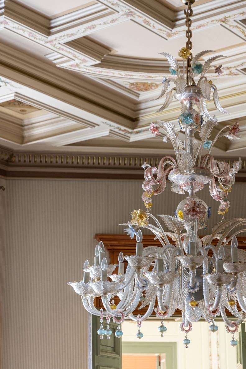 Filigrāni saglabāts krāsojums, dekori, oriģinālās akmens flīzes, parketa grīdas, griestu gleznojumi, koka durvis. Restaurēti kamīni un vitrāžas ar Latvijas ainavu gleznojumiem otrā stāva zālēs, kas saglabājušās pat no 19. gadsimta.