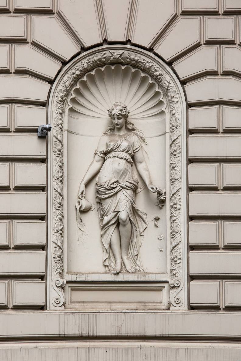 Ēkas iekštelpās vācu arhitekti prata panākt maksimāli daudz dienasgaismas. Glāstoša saule ieplūda gan saimnieku buduārā, lija ēdamzāles vitrāžās, spoguļojās salonu lustrās, griestu dekoros. Rīgā ieradās nesen Berlīnes Mākslas akadēmiju absolvējušais 24 gadus vecais tēlnieks Augusts Folcs. Pfābu aicināts, viņš pameta dzimto Vāciju un atbrauca izpildīt fasādes noformēšanas pasūtījumu. Arī viņš ievēroja saules ceļu ap grezno namu. Pusdienas saule apspīdēja izsmalcināto Floras skulptūru iekšpagalma pusē. Vakara saule izcēla pret ielu vērstā balkona lauvas un ciļņus virs parādes durvju arkas – saimnieku linu biznesa alegoriju divu meiteņu tēlos – un sienas nišā nostādīto vestālieti, Senās Romas svētās uguns sargātāju. Tēlnieks tā arī palika Rīgā uz dzīvi un turpināja radīt – nu jau bija pilsētā slavens, drīz pat varēja atvērt savu tēlniecības darbnīcu tagadējā Krišjāņa Valdemāra ielā 31. Folca izcilie darbi joprojām rotā daudzus Rīgas namus, piemēram, Mākslas muzeju, Latvijas Banku. Tapa arī Rolanda skulptūra pie Melngalvju nama, Nimfa apstādījumos pie operas, atlanti pie ieejas Nacionālajā teātrī…