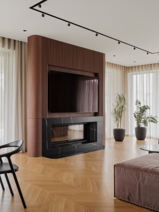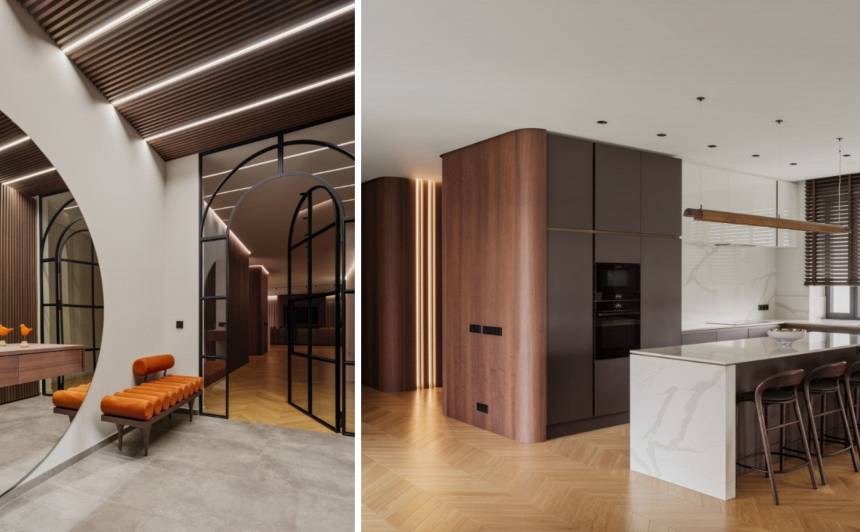 Uzburot vīziju par ģimenei piemērotāko interjeru, saimnieki uzsvēra vēlmi pēc siltas noskaņas, kuru palīdz radīt brūnie un krēmīgie toņi, ozolkoka parkets un koka panelējumi – elementi, kas rada patiesu mājīgumu. Dažādu iespējamo variantu izvērtēšanas procesā kopā ar dizaineriem nonākts pie lēmuma mēbeles izgatavot no riekstkoka, kas kļuva par visa interjera centrālo akcentu. Otrs vadmotīvs – arku, apļu un pusapļu formas interjerā atkārtojas un parādās jau ieejas zonā. Te saimnieki vēlējās radīt plašu, ar durvīm nodalītu vējtveri, un izlemts par labu stikla durvīm ar liektu metāla rāmi: caurskatāmība vedina doties uz plašo atpūtas un virtuves zonu – ģimenei nozīmīgāko telpu. «Mēs sapņojām par plašu, gaišu zonu ar kamīnu un ērtu dīvānu un vēlējāmies, lai viesistaba plūstoši savienotos ar virtuvi. Tajā vietas pietiek visiem – arī mazajiem pavāriem, kas ar prieku man palīdz un vēlas arī paši eksperimentēt,» priecājas saimniece.