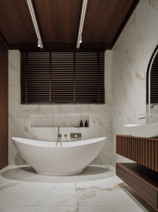 Master vannasistabā arkas motīvs atkārtojas spoguļu formās, bet riekstkoks un rievotās fasādes – mēbelēs. Šeit izmantota kvalitatīvā Hansgrohe santehnika, PAA vannas un izlietnes.