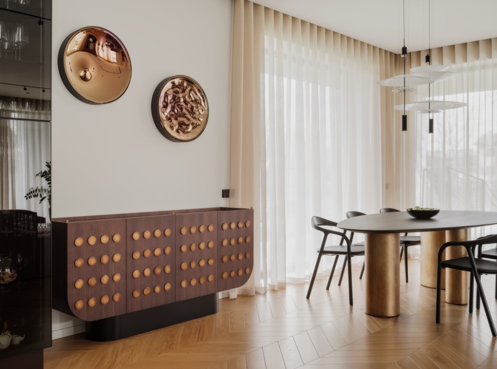 Atpūtas telpai raksturu piešķir kumode Eclatora ar misiņa dekoratīvajiem fasādes elementiem un an&angel stikla objekti SUN&MOON.