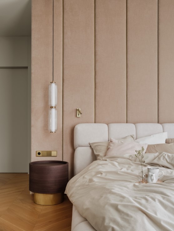 Šajā ēkā rūpīgi padomāts arī par individuālajām telpām. Viss nams ir gaišs, taču saimnieka darba kabinets izceļas ar izteikti maskulīnu noskaņu – tajā dominē tumšie, sarkanīgie un brūnie toņi. Iepretim darba galdam izvietoti 3D tumši brūni ozolkoka sienas paneļi ar iedziļinātu kapara TV apmali un brūns ādas dīvāns. Savukārt pāra guļamistaba veido gluži citu atmosfēru. Saimniece to vēlējās ieturēt gaišos, krēmīgos toņos, lai telpa šķistu īsta miera osta. Mājīguma iespaidu papildina siena, kas izgatavota no mīksta panelējuma un atkārto gultas ritmu nedaudz tumšākā toņkārtā. Arī te smalkās detaļās – gaismekļos, nakts galdiņu apdarē, slēdžos un kontaktligzdās – izmantots misiņš.