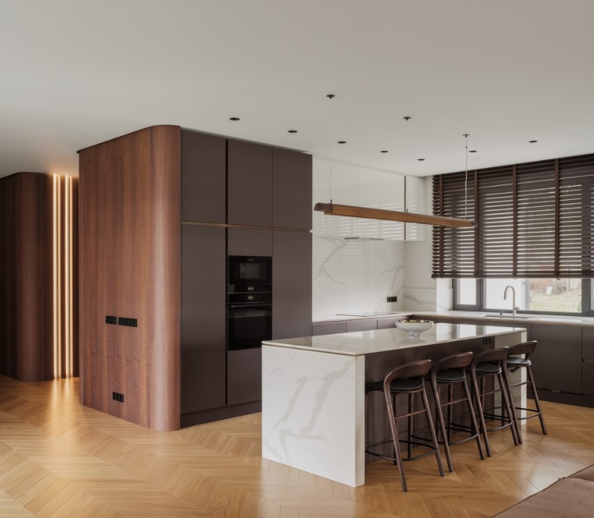 Virtuves mēbeles ir no augstvērtīgiem materiāliem ar neskaitāmiem atvilktņu un uzglabāšanas risinājumiem. Dabiskais akmens – Golden no Stone Italiana. Koka žalūzijas un aizkari radīti aizkaru darbnīcā RABATA.