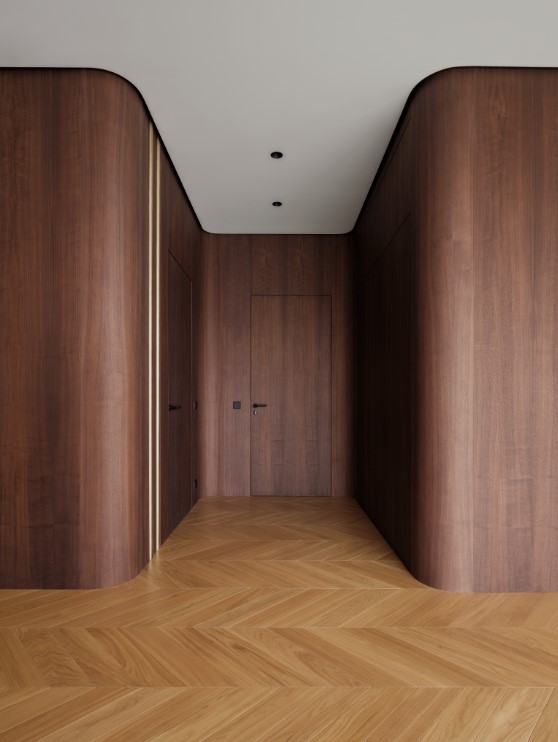 Plašajos gaiteņos riekstkoku panelējumā apslēptas plauktu un skapju sistēmas. Apjomā iestrādātais dekoratīvais apgaismojums telpā rada mājīgu noskaņu.