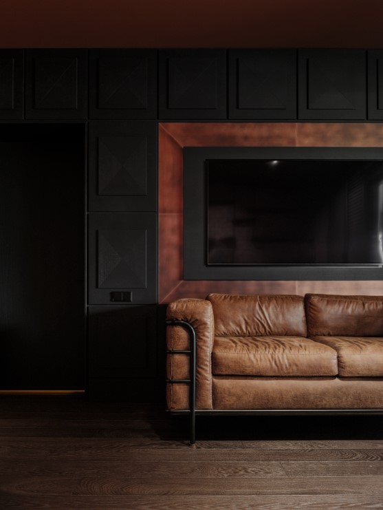 Saimnieka kabinets izceļas ar maskulīnu noskaņu – Kanttari šeit izgatavojis tumši brūnus ozolkoka panelējumus un dīvānu. Virs tā – televizora ekrāns, caur kuru pieslēgties darba video konferencēm.