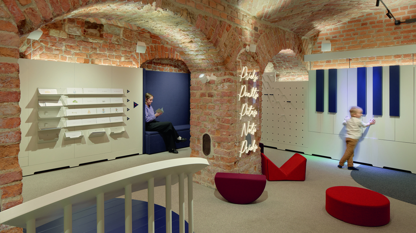 Pagrabstāva vēsturisko velvju ķieģeļu raupjums mīkstināts ar neitrālu paklāja segumu, krāsainiem pufiem un siltu apgaismojumu. Arhitektes atzīmē universālo un daudzfunkcionālo sienas paneļu risinājumu – pa telpu perimetru izbūvēta niansēti pelēki krāsotu sienas paneļu sistēma, kurā integrēti aktivitāšu elementi un nišas, vienlaikus diskrēti noslēpjot inženierkomunikācijas. Klases telpā sienas paneļi atlokāmi kā galdi, un tajos integrēti plaukti mācību materiāliem.