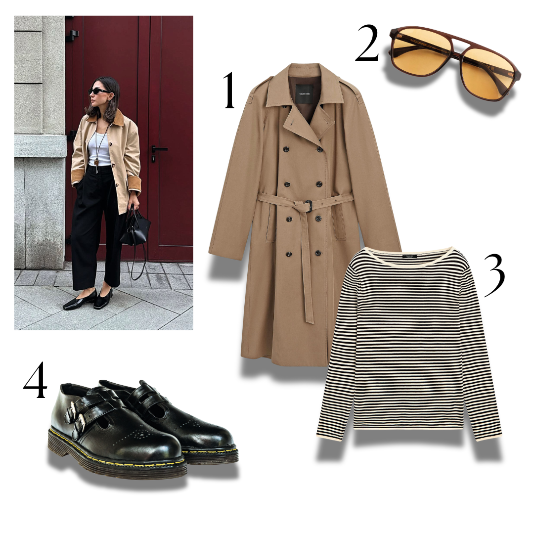 - Klasisks mētelis – vilnas vai kašmira, neitrālā tonī, ar vienkāršu siluetu.