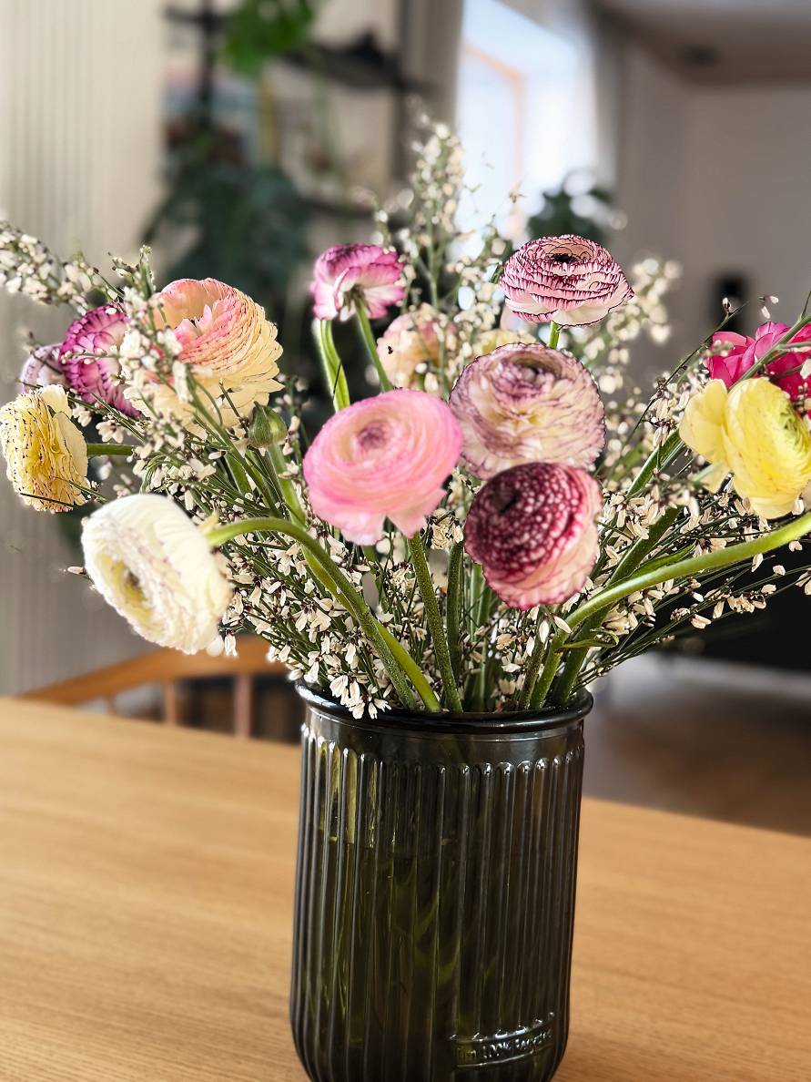 Arī rozes, ja tās interesanti sakombinē, kompozīcijās ir ļoti skaistas. Ziemā man ļoti patīk eikalipts, bet, tuvojoties siltākam laikam, ziedošo augu kompozīcijas vienmēr papildinu ar krūmu un koku zariem, ko atnesu no meža vai dārza. Bieži izmantoju, piemēram, bērza, aličas, ievas zarus, izplaucēju arī pa kādam ķiršu, cidonijas vai dekoratīvās ābeles zaram. Bet, kamēr tie nav izplaukuši, vāzes papildinu ar ziedu bāzēs iegādātajiem izplaucētajiem zariņiem. Viena no skaistākajām kompozīcijām, ko esmu izveidojusi pēdējā laikā, ir ranunkuļi kopā ar izplaucētu Genista White jeb balto slotzari. Tā kā struktūraugi mēdz ilgāk saglabāt savu krāšņo izskatu, dažkārt piepērku tiem klāt ziedošos augus, izšķiroju iepriekšējo kompozīciju un veidoju atkal kaut ko jaunu.»