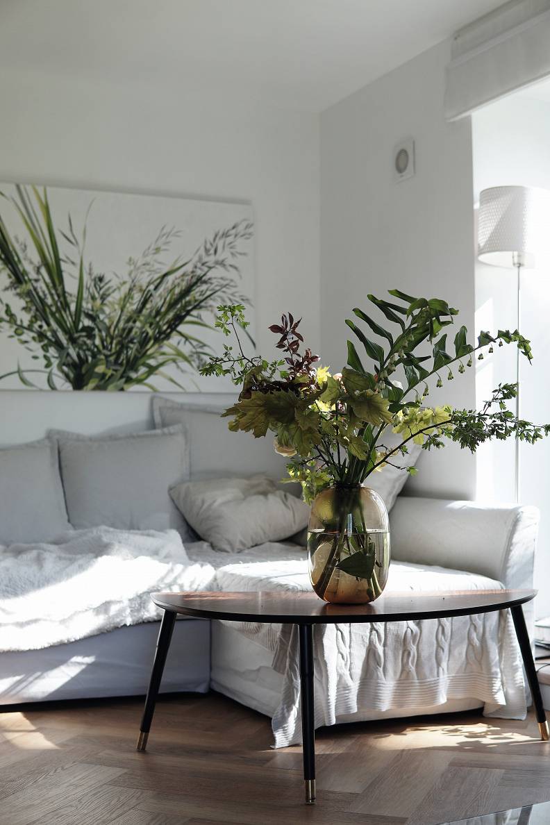Vāzēs lieku ne tikai bērzu, ceriņu, ķiršu, lazdu, pūpolu zarus, bet arī kādu papardi, puķuzirņu stīgu, mūžzaļos augus – tūjas zariņu vai efeju.