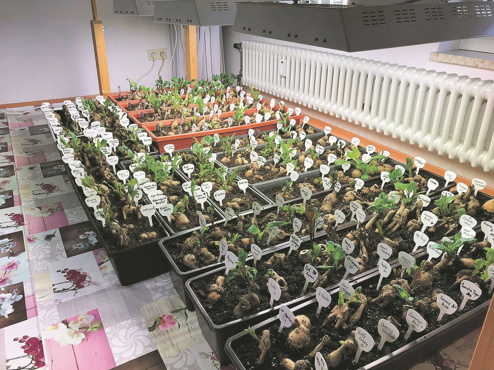2. Pēc 2–3 nedēļām gumiņi ir izveidojuši jaunās saknītes, un pie tiem sāk parādīties zaļi punktiņi un augt jaunie dzinumi. Tad ļoti svarīga ir gaisma, citādi dzinumi sāks stīdzēt un būs pārāk tieviņi.