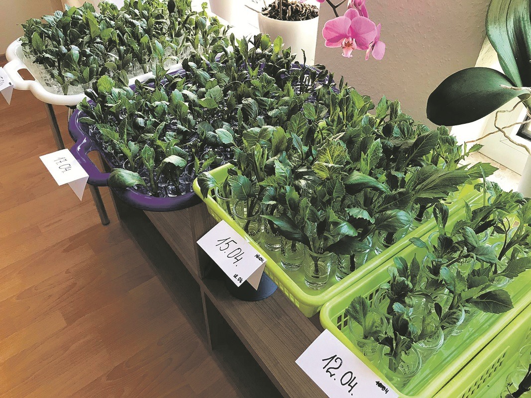 Nolauztais dzinums uzreiz jāliek ūdenī, lai neapkalst. Taču ūdens nedrīkst būt par dziļu, sevišķi pirmajās četrās dienās, – tajā drīkst atrasties tikai dzinuma pēdiņa. Vēlāk jau var būt mazliet vairāk, taču arī ne pusglāze. Nav skaidrs, kāpēc tā notiek, bet, ja ūdens ir par dziļu, dzinumi saknītes neveido, bet pēc laika sāk pūt. Ūdens līmenis jāuzmana – lai neiztvaiko, lai dzinumi neizdzer. Ja vajadzīgs, jāpapildina. Katrā glāzītē liek tikai vienu dzinumu – ja nu tā izsusējusi vai apgāzusies, bojā aizies tikai tas viens, nevis vesels pušķis. Ūdens glāzītē ik pārdienas jāapmaina, lai vienmēr būtu tīrs un svaigs. Pēc 7–10 dienām sāk parādīties saknītes.