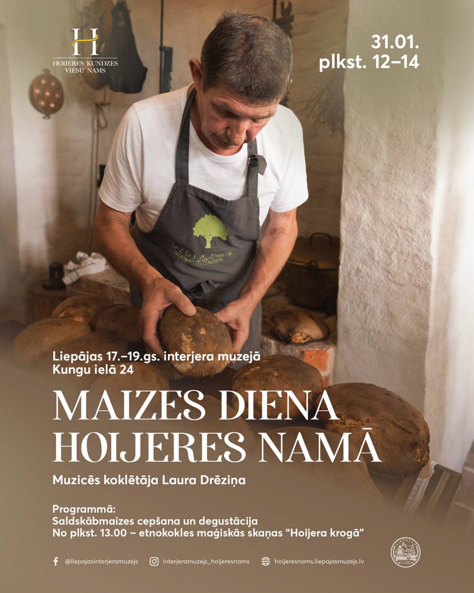 Sestdien, 31. janvārī, no pulksten 12 līdz 14 Liepājas interjera muzejs Hoijeres kundzes viesu nams aicina uz Maizes dienu. Vēsturiskā nama maizes krāsnī jau atkal tiks cepta saldskābā maize, bet pulksten 13 Hoijeres krogā uzstāsies mūziķe, koklētāja un etnomūzikas skolas Zelta stīgas dibinātāja Laura Drēziņa. Maizes krāsns tiks iekurta jau pulksten 10, tāpēc tie, kuri vēlas vērot maizes cepšanu, aicināti ierasties laikus. Savukārt degustācijai un iegādei svaigi cepta maize būs pieejama ap pulksten 12.